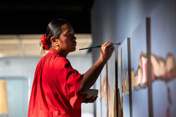 Cora-Allan puts the finishing touches on a work in Recording Mauri - her 2026 exhibition at Wellington's City Gallery.