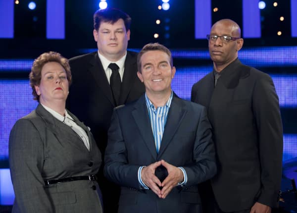 Anne Hegerty with fellow Chasers Mark Labbett and Shaun Wallace, and host Bradley Walsh.